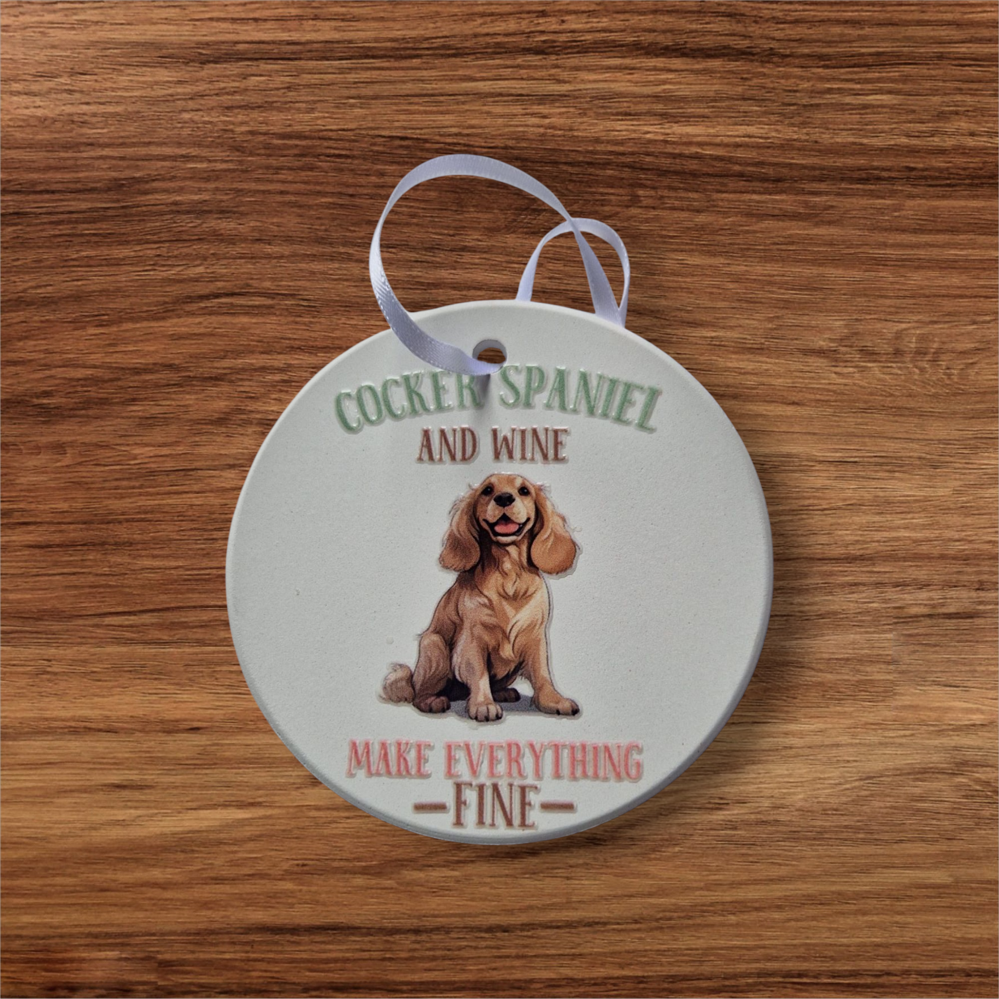 Cocker Spaniel Hanging Ceramic Ornament. Perfect gift for Dog Lovers. 8 x 8cm with White Ribbon. Cocker Spaniel and Wine make Everything