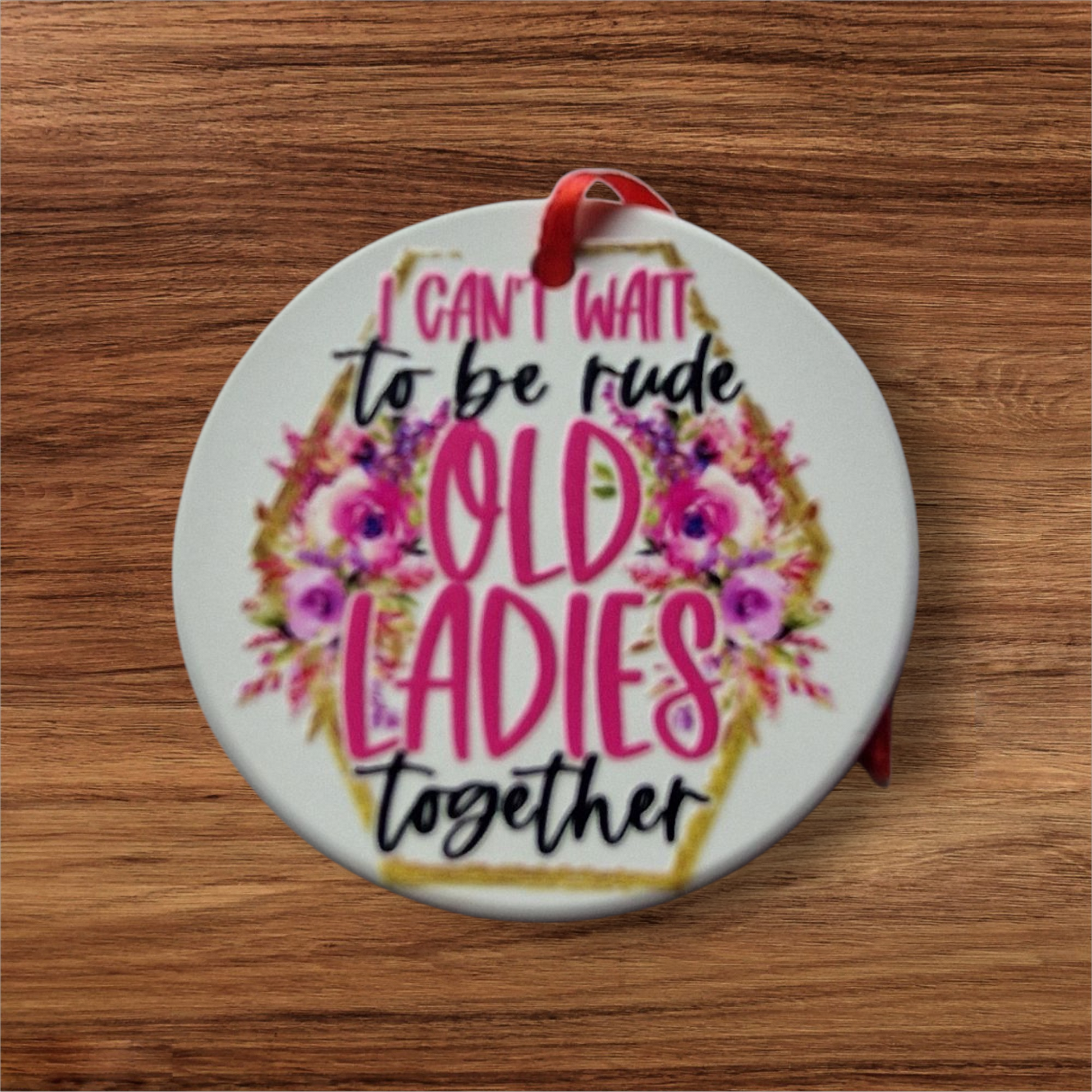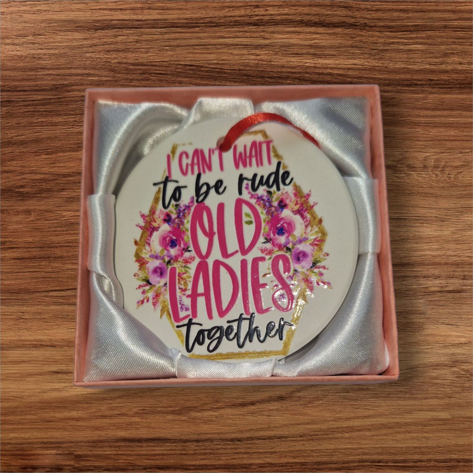 Friend Hanging Ornament that says "I can't wait to be rude old ladies together". 8 x 8cm with Red Ribbon.