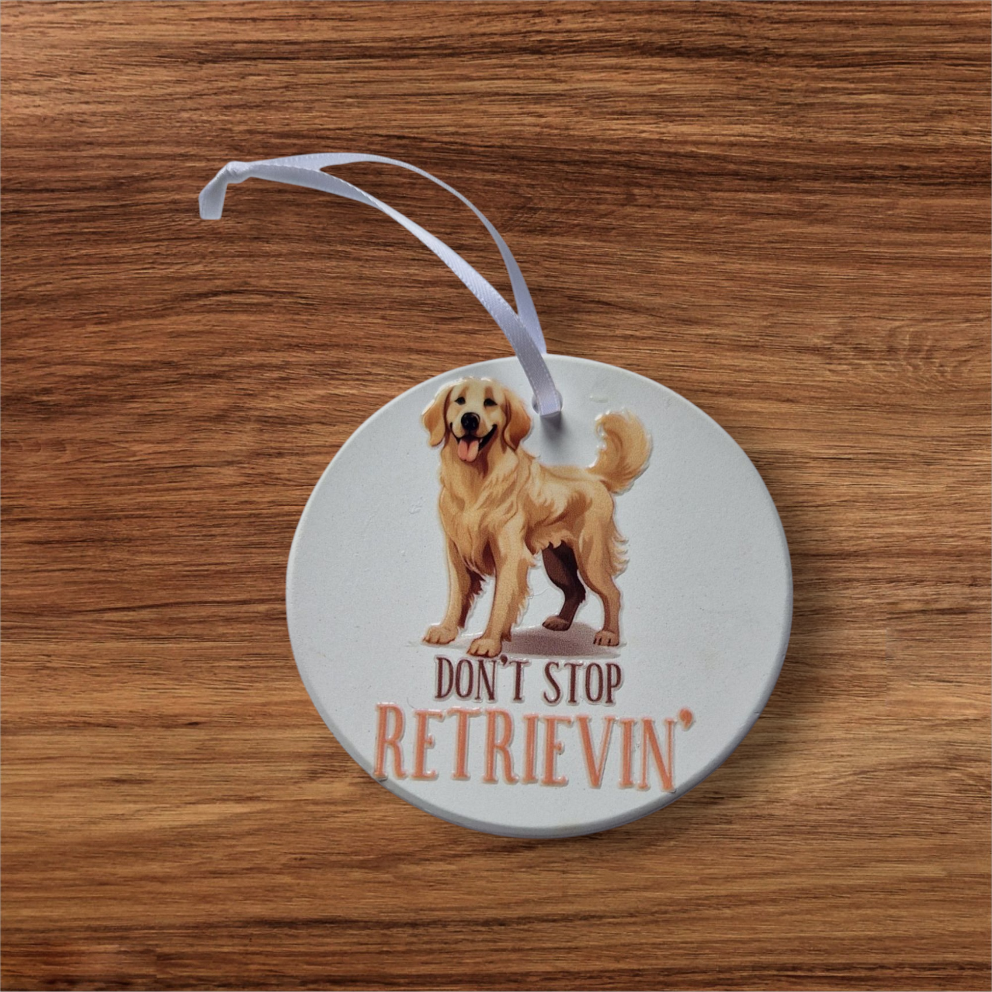 Golden Retriever Hanging Ceramic Ornament. Perfect gift for Dog Lovers. 8 x 8cm with White Ribbon. Don't Stop Retrievin'